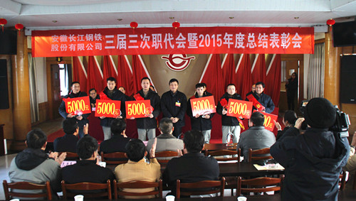 总经理作了题为《深耕细作补短板,真抓实干扭亏损,众志成城奋发有为坚决打赢长钢生存保卫战》的工作报告。报告指出:2015年,面对前所未有的困难,公司紧紧围绕“安全、环保、质量、效益”工作主题,科学有效组织生产,积极实施对标挖潜,狠抓两头市场经营,不断夯实基础管理,确保了生产经营建设平稳有序运行。报告强调:2016年是“十三五”规划开局之年,准确把握面临形势,积极谋划和做好明年各项工作,对于长钢立足当前保生存,着眼未来求发展,具有重大意义。为此,长钢必须认真领会中央经济工作会议 “去产能、去库存、降成本、补短板、防风险”五大任务的精神实质,认清形势,找准出路,继续发挥长江钢铁机制优势,在系统降本、节能减排、技术进步、质量提升和品牌建设上发力,强化基础管理,打好降本增效“组合拳”,尽快走出困境,实现扭亏为盈。